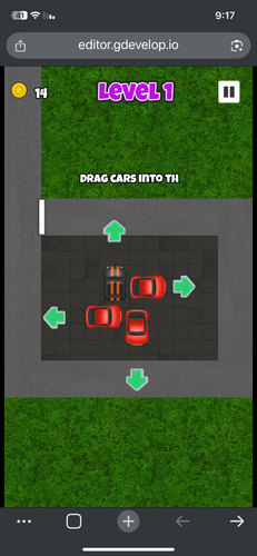 The game was created using the GDevelop engine. It is a puzzle game involving cars. It is a beautiful and enjoyable game that includes puzzles and requires thinking.